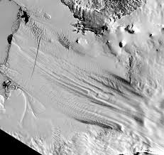 Várias medições têm capturado a camada de gelo da Antártida Ocidental mudando muito rapidamente na região onde ele deságua no Mar de Amundsen. Crédito Landsat